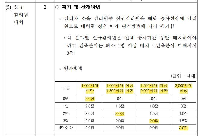 - 법령 ' 주택건설공사 감리자지정기준'의 '서식 2'의 '자기평가서'에 보면 감리 입찰시 자격 점수를 자체 평가할